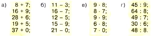 57. Подумайте, какие математические знания вам могут потребоваться, если вы собрались пойти: а) в бассейн; б) в магазин. 58. Какие двузначные числа можно записать с помощью цифр: а) 6 и 0; б) 1, 5 и 0; в) 3 и 5? 59. Сколько трёхзначных чисел можно составить из цифр 3, 5, 7, если в записи числа цифры не будут повторяться? Какое из этих чисел наибольшее и какое наименьшее? 60. Длина Волги 3530 км. Днепр на 1330 км короче Волги, а Урал длиннее Днепра на 228 км. Какова длина реки Урал? На сколько километров Волга длиннее Урала? 61. Лыжник за 5 ч прошёл 75 км. Сколько времени ему потребуется, чтобы с той же скоростью пройти 60 км? 62. Автобус шёл 2 ч со скоростью 45 км/ч и 3 ч со скоростью 60 км/ч. Какой путь прошёл автобус за эти 5 ч? 63. Решите задачу: 1) Мотоциклист едет со скоростью 95 км/ч, а скорость велосипедиста на 76 км/ч меньше. Во сколько раз скорость мотоциклиста больше скорости велосипедиста? 2) Скорость теплохода 45 км/ч, а скорость электровоза на 90 км/ч больше. Во сколько раз скорость теплохода меньше скорости электровоза? 64. Выполните действия: