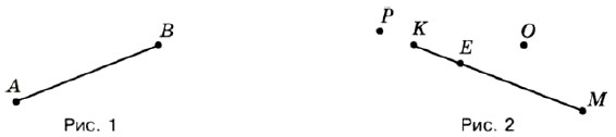 Любые две точки можно соединить только одним отрезком. На рисунке 2 изображён отрезок КМ. Точка Е лежит на этом отрезке между точками К и М, а точки О и Р на нём не лежат.