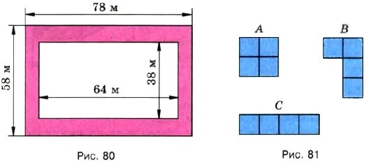 801. Какова длина стороны квадрата, если его площадь: а) 4 дм2; б) 25 см2; в) 81 м2; г) 400 см2? 802. Площадь прямоугольного участка 1 га. Приведите примеры, какими могут быть длина и ширина участка. 803. Какое число возвели в куб, если получили: 27; 1; 64? 804. Во многих западных странах использовалась единица площади акр. Акр примерно равен 4047 м2. Сравните 1 акр и 1 га. 805. Вычислите площадь фигуры на рисунке 80. 806. Равны ли фигуры, изображённые на рисунке 81? Равны ли площади этих фигур? Равны ли их периметры?