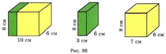 826. Высота комнаты 3 м, ширина 5 м и длина 6 м. Сколько кубических метров воздуха находится в комнате? 827. Длина аквариума 80 см, ширина 45 см, а высота 55 см. Сколько литров воды надо влить в этот аквариум, чтобы уровень воды был ниже верхнего края аквариума на 10 см? 828. Прямоугольный параллелепипед (рис. 88) разделён на две части. Найдите объём и площадь поверхности всего параллелепипеда и обеих его частей. Равен ли объём параллелепипеда сумме объёмов его частей? Можно ли это сказать о площадях их поверхностей? Объясните почему.