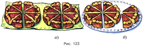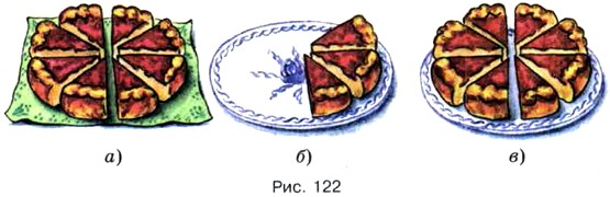 § 5. Обыкновенные дроби 25. Правильные и неправильные дробиРазрезали пирог на 8 равных частей (рис. 122, а) и 3 части положили на тарелку. На ней оказалось