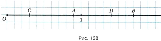 1153. Сравните числа: 23, 2300, 023, 230, 00 023. 1154. Замените дробью или смешанным числом частные: 9:2; 5:11; 8 : 10; 15 : 10. 1155. Укажите координаты точек А, В, С, D (рис. 138). Каково расстояние в единичных отрезках между точками: О и С, О и D, А и В, С и D?