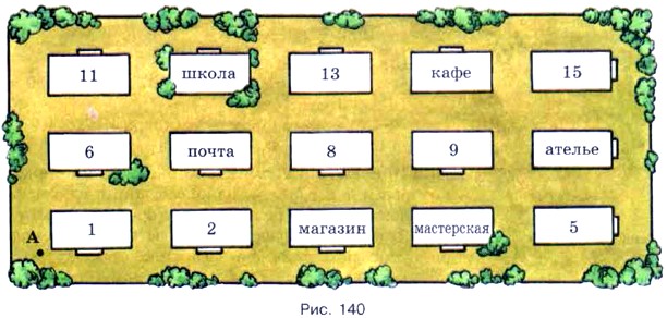 § 6. Десятичные дроби. Сложение и вычитание десятичных дробей 30. Десятичная запись дробных чисел. Математика 5 класс1162. На рисунке 140 показан план квартала города. Ширина каждого дома 25 м, длина 50 м, ширина дорог 25 м. Расскажите, как ближайшим путём пройти от точки А до входа в школу; на почту; в ателье; в дом № 9. Как бы вы объяснили дорогу от дома № 5 до дома № 11; до дома № 6?