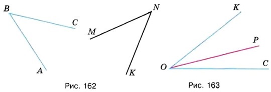 Если один угол можно наложить на другой так, что они совпадут, то эти углы равны. Например, на рисунке 162 ∠ABC = ∠MNK. Из вершины угла СОК (рис. 163) проведён луч ОР. Он разбивает угол СОК на два угла — СОР и РОК. Каждый из этих углов меньше угла СОК. Пишут: ∠COP < ∠COK и ∠POK < ∠COK.