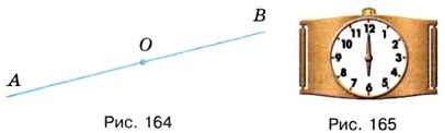 Два дополнительных друг другу луча образуют развёрнутый угол. Стороны этого угла вместе составляют прямую линию, на которой лежит вершина развёрнутого угла (рис. 164). Часовая и минутная стрелки часов образуют в 6 ч развёрнутый угол (рис. 165).