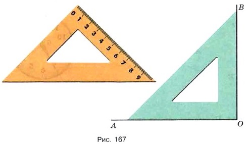 Для построения прямого угла пользуются чертёжным треугольником (рис. 167). Чтобы построить прямой угол, одной из сторон которого является луч ОА, надо: