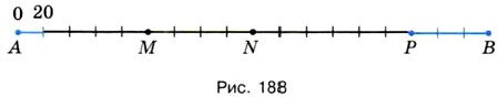 1742. На рисунке 188 изображена шкала расстояний от города А до города В. Каждое деление шкалы соответствует расстоянию 20 км. Точками М, N, Р отмечены расстояния, которые прошла автомашина через каждый час, двигаясь из города А в город В. Определите: а) чему равно расстояние от города А до города В;