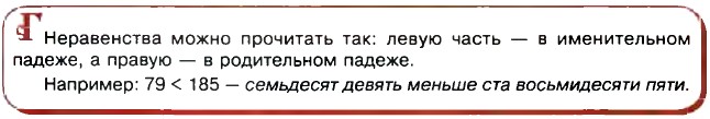 Результат сравнения двух чисел записывают в виде неравенства, применяя знаки < (меньше) и > (больше). Например, 4 < 7, 8 > 7. Число 3 меньше, чем 6, и больше, чем 2. Это записывают в виде двойного неравенства 2 < 3 < 6. Так как нуль меньше, чем единица, то записывают 0 < 1.