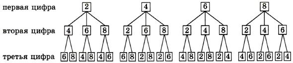 228. Сколько трёхзначных чисел можно составить из цифр 2, 4, 6, 8, ДЖ если цифры в записи числа не повторяются? Р е ш е н и е. Первой цифрой числа может быть любая из четырёх данных цифр, второй — любая из трёх других, а третьей — любая из двух оставшихся. Получается: