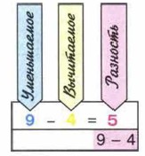 Число, из которого вычитают, называют уменьшаемым, а число, которое вычитают, — вычитаемым. Результат вычитания называют разностью. При вычитании 9-4 = 5 число 9 — уменьшаемое, 4 — вычитаемое, 5 — разность.
