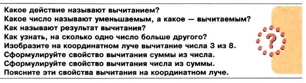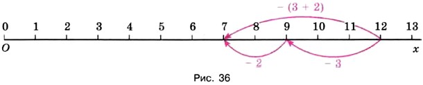 1. Для того чтобы вычесть сумму из числа, можно сначала вычесть из этого числа первое слагаемое, а потом из полученной разности — второе слагаемое. Это свойство называют свойством вычитания суммы из числа (рис. 36).