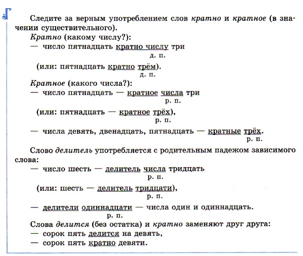 Пусть на столе лежат пачки, в каждой из которых по 8 печений. Не раскрывая пачек, можно взять 8 печений, 16 печений, 24 печенья, а 18 печений так взять нельзя. Числа 8, 16, 24 делятся на 8, а 18 на 8 не делится. Говорят, что числа 8, 16, 24 кратны числу 8, а число 18 не кратно числу 8.