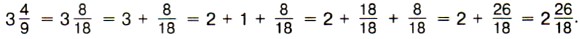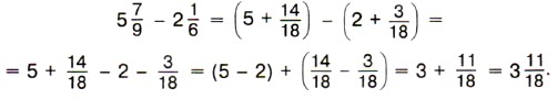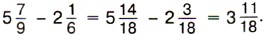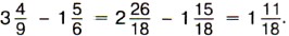 Пишут короче: Если дробная часть уменьшаемого окажется меньше дробной части вычитаемого, то надо превратить в дробь с тем же знаменателем одну единицу целой части уменьшаемого. Пример 4. Найдём значение разности Р е ш е н и е. Приведём дробные части данных чисел к наименьшему общему знаменателю 18: