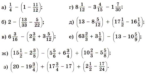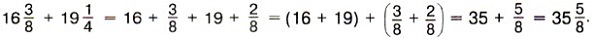 § 2. Сложение и вычитание дробей с разными знаменателями 12. Сложение и вычитание смешанных чиселПереместительное и сочетательное свойства сложения позволяют привести сложение смешанных чисел к сложению их целых частей и к сложению их дробных частей. Пример 1. Найдём значение суммы Р е ш е н и е. Приведём дробные части чисел к наименьшему общему знаменателю 8, затем представим смешанные числа в виде суммы их целой и дробной частей: