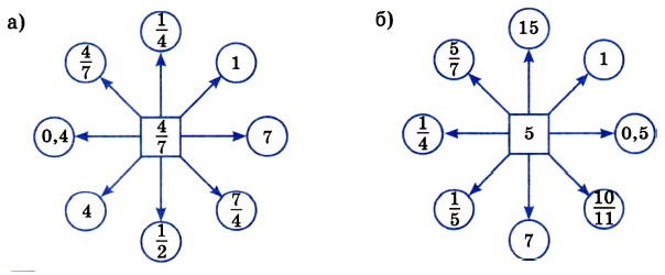 669. Во сколько раз меньше своего обратного число: 670. Придумайте число, которое меньше своего обратного в 4 раза; в 9 раз. 671. Разделите устно центральное число на числа в кружочках: