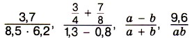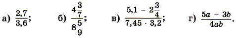 693. Напишите дробное выражение, числитель которого 3а - 2b, а знаменатель — 6,7х + у. 694. Запишите в виде дробного выражения частное: (3,8 • 4,5 - 0,7): (6,3 : 2,1 - 2,6). Найдите значение этого выражения. 695. Найдите значение выражения: