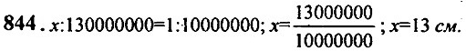 840. Пусть масштаб карты равен 1:22500000. Результат измерения расстояния на карте между Москвой и Киевом равен приблизительно 3,3 см. Расстояние между городами на местности будет равно: 3,3 • 22500000 = 74250000 см = 742500 м = 742,5 км. 841. Выполните самостоятельно. 842. Масштаб плана равен: 1 см : 20м = 1 : 2000. 843. 25 : x = 1 : 300; x = 25 • 300; x = 7500 см = 75 м. Длина дома на местности 75 м.