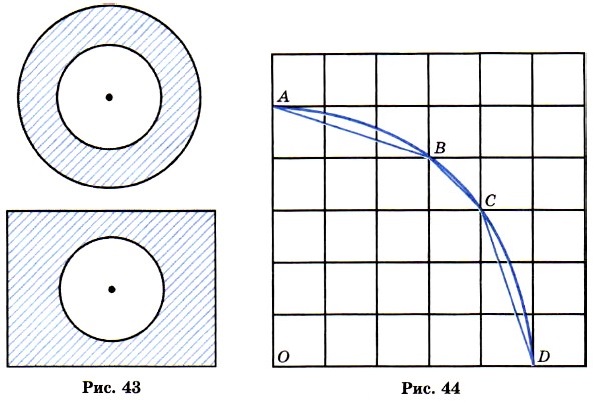 853. Измерьте радиус и вычислите площадь каждого круга на рисунке 42. 854. Окружность арены во всех цирках мира имеет длину 40,8 м. Найдите диаметр и площадь арены 855. Диаметр циферблата кремлёвских курантов 6,12 м, длина минутной стрелки 2,54 м. Найдите площадь циферблата. Какой путь проходит конец минутной стрелки курантов за час? Ответы округлите до сотых долей метра. 856. Выполните измерения и вычислите площадь каждой заштрихованной фигуры на рисунке 43. 857. По рисунку 44 найдите площадь пятиугольника OABCD. Сравните её с площадью четверти круга, радиус OD которого равен 5 см.