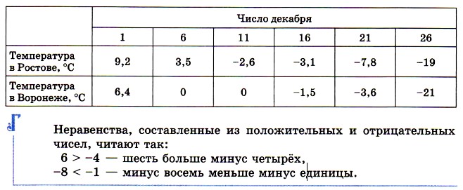 974. Отметьте на прямой числа 0; 1; -3; -5; 8; -7; -2; -10 и 3. Сравните: а) 0 и 3; б) 0 и -5; в) 8 и 0; г) -7 и 0; д) -2 и 3; е) -7 и 1; ж) 1 и -10; з) 3 и -3; и) 1 и 8; к) -5 и -3; л) -5 и -10; м) -2 и -5. 975. В Ростове и Воронеже измеряли температуру 1, 6, 11, 16, 21 и 26 декабря в 12 ч дня. Результаты (в градусах Цельсия) указаны в таблице. Сравните температуру в Ростове и Воронеже в одно и то же время.