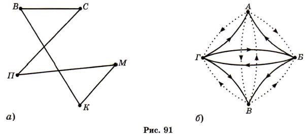 1219. Найдите наибольшее значение выражения: а) -|x|; б) 2 - |х|; в) -|х - 1|; г) -(х - 1)2. 1220. Решать некоторые математические задачи помогают специальные схемы, состоящие из точек и соединяющих их дуг или стрелок рис. 91). Такие схемы называют графами, точки называют вершйнами графа, а дуги — рёбрами графа. Ответьте на вопросы, используя графы. а) В спортивном зале собрались Витя, Коля, Петя, Серёжа и Максим (рис. 91, а). Оказалось, что каждый из мальчиков знаком только с двумя другими. Кто с кем знаком? (Ребро графа означает «мы знакомы».) б) Во дворе гуляют братья и сёстры одной семьи. Кто из этих детей мальчики, а кто девочки (рис. 91,б)? (Пунктирные рёбра графа исходят от сестёр, а сплошные — от братьев.)