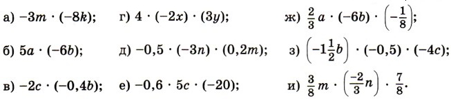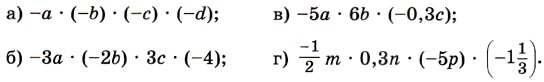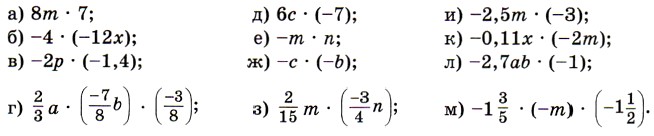 § 8. Решение уравнений 40. КоэффициентПереместительное и сочетательное свойства умножения позволяют упрощать выражения. Пример 1. Упростим выражение 0,3а • (-0,7b). Р е ш е н и е. Это выражение является произведением четырёх множителей: 0,3 • а • (-0,7) • b. Сгруппировав отдельно числовые и отдельно буквенные множители, получим: 0,3а • (-0,7b) = 0,3 • а • (-0,7) • b = (0,3 • (-0,7)) • (а • b) = -0,21 аb. Число -0,21 называют коэффициентом в полученном выражении.