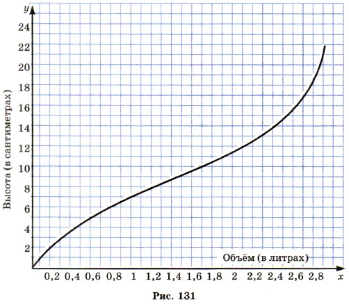 1444. В пустой графин (рис. 130) наливают воду стаканом, содержащим 0,2 л, и каждый раз отмечают высоту воды в графине. На рисунке 131 изображён получившийся график. Пользуясь графиком, определите: а) какой будет уровень воды в графине, если в него налить 0,8 л воды; 2 л воды;