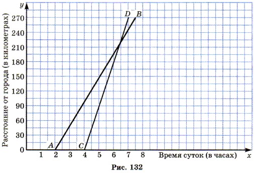 1445. На рисунке 132 изображены графики движения двух автомобилей: грузового (график АВ) и легкового (график CD). Определите, пользуясь графиком: а) в какое время вышли автомобили из города;