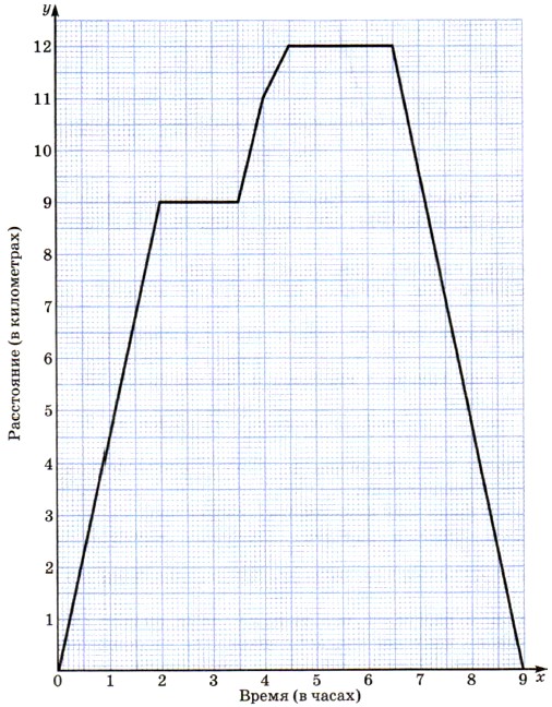 1446. Рыболов рассказал, что, выйдя из дома, он шёл 2 ч по берегу реки и дошёл до места, где в неё впадает приток. Там он ловил рыбу 1,5 ч, а потом пошёл дальше. Через 1 ч он выбрал новое место, где в течение 2 ч ловил рыбу, варил уху, обедал. После обеда он отправился домой. На всё это он затратил 9 ч. График движения рыболова изображён на рисунке 133. Ответьте на следующие вопросы. а) На каком расстоянии от дома был рыболов через 30 мин; через 4 ч 40 мин; через 5,5 ч после выхода из дома?