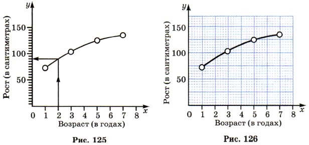 § 9. Координаты на плоскости 47. ГрафикиКогда Маше был год, её рост составлял 70 см, когда ей было 3 года — 100 см, 5 лет — 120 см и 7 лет — 130 см. По этим данным можно построить диаграмму (рис. 123). На этой диаграмме не полностью видно, как менялся рост Маши: она росла всё время, а на диаграмме виден её рост, только когда ей был 1 год, 3 года, 5 лет и 7 лет. Соединим верхние концы столбиков отрезками. Получится ломаная линия, которая нагляднее показывает, как изменялся рост Маши (рис. 124). Мы видим, что в 4 года её рост примерно равнялся 110 см, а в 6 лет — 125 см.