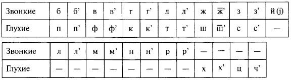 Согласными называются звуки, при образовании которых в органах речи воздух встречает какие-либо преграды. Согласные состоят или из одного шума, или из шума и голоса. В зависимости от этого выделяют сонорные согласные звуки, в образовании которых голос преобладает над шумом ([л], [л’], [м], [м’], [н], [н’], [р], [р’]), и шумные, в которых преобладает шум. Шумные согласные делятся на звонкие (шум преобладает над голосом) — [б], [б’], [в], [в’] и т. д. и глухие (состоят только из шума) — [к], [к’], [п], [п’] и т. д. В современном русском языке большинство согласных образуют пары по признаку глухо- сти/звонкости. Однако некоторые согласные являются только глухими, другие — только звонкими (см. таблицу).