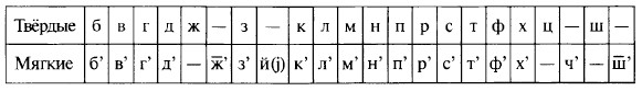 По признаку твёрдости/мягкости в современном русском языке всегда твёрдыми являются звуки [ц], [ж], [ш]; всегда мягкими — [й] ([j]), [ч’], (см. таблицу).