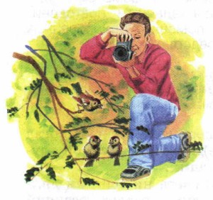 На кустах акаци.. с..дело много вороб(?)ёв. Подкрался я к ним поближе нацелился своим аппаратом гляжу1 в гл..зок.4 Вот передо мной на ветк.. воробышек. Да какой, оказывает(?)ся, нарядный! Я раньше этого и (не)замечал. Верх головк.. серенький, будто серенькая шапоч(?)ка надета. Грудка и брюшко тоже серые а спинка и крылья потемнее: они коричневатые, пёстренькие. Вверху, на крыльях — белая поло..ка.