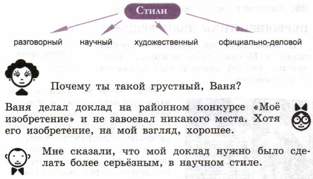 84. Прочитайте высказывание (доклад) Вани. В каком стиле оно написано? Почему не понравилось членам жюри? Я изобрёл зеркало заднего вида для самоката. Как-то я ехал по дороге, и вдруг, откуда ни возьмись, грузовик! Ужас! И свернуть было некуда! Еле увернулся, упал в канаву. Пришёл домой, а тут мама увидела, что я грязный, и давай ругать. И тут я подумал: «Вот бы мне зеркало заднего вида, тогда я вовремя бы увидел грузовик!» 85. Прочитайте текст. Определите его стиль. Докажите своё мнение. • Объясните написание слов с пропущенными буквами.
