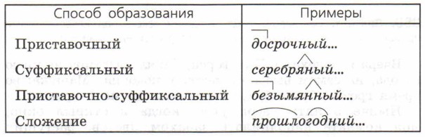 386. Диктант из слов с непроверяемыми орфограммами, правописание которых изучалось в теме «Имя прилагательное». 387. Заполните 3-4 примерами таблицу «Способы образования прилагательных».