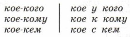 Сравните неопределённые местоимения в левой и правой колонках. Чем они различаются по написанию? От какого условия зависит выбор дефисного и раздельного написания приставки кое-?