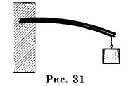 270. Нарисуйте в тетради шарик, подвешенный к концу пружины. Как называются силы, действующие на шарик и на пружину? Покажите, куда направлены эти силы. 271. Что происходит с волокнами бруска на верхней грани (рис. 31) при изгибе?