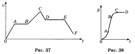 311. На столе лежит яблоко (рис. 35) весом 0,6 Н. В выбранном вами масштабе изобразите графически силу тяжести яблока и его вес. 312. Две гири в 50 г и 10 г висят на одной веревочке (рис. 36). Определите силу натяжения веревочки. 313. Человек массой 70 кг держит груз массой 30 кг. С какой силой давит человек на землю? 314. Рабочий массой 65 кг пытается поднять с земли груз массой 40 кг, прилагая силу в 250 Н. С какой силой рабочий давит на землю? С какой силой давит на землю груз? 315. Вычислите суммарную силу тяги, действующую на поезд, который везут два тепловоза. Один развивает силу тяги 80 кН, другой 85 кН. 316. Силы 2 Н и 18 Н, действующие на тело, направлены по одной прямой в одну сторону. Найдите их равнодействующую и изобразите силы графически. 317. Подъемный кран поднимает равномерно вертикально вверх груз весом 8 кН. Изобразите силы, действующие на груз, векторами в масштабе: 1 см соответствует 2 кН. 318. На горизонтальном участке пути сила тяги паровоза 30 кН, сила сопротивления движению 10 кН. Изобразите эти силы векторами в масштабе: 1 см соответствует 10 кН. Будет ли поезд двигаться равномерно? Почему? 319. С помощью стального троса буксир тянет баржу (от буксира к барже протянут стальной трос) в спокойной воде. Баржа движется равномерно. Укажите, какие силы действуют на баржу. 320. На рисунке 37 дан график скорости движения поезда. Что можно сказать о соотношении силы тяги и силы сопротивления движению на различных участках пути поезда? 321. На рисунке 38 показан график пути поезда. Перечертите его в тетрадь и выделите на графике участки, на которых действующие на поезд силы уравновешены.
