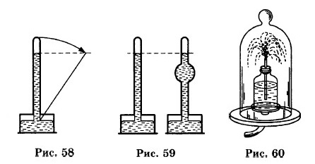 438. Почему не выливается вода из перевернутого стакана (рис. 57)? 439. Выразите нормальное атмосферное давление в паскалях (Па) и гектопаскалях (гПа). 440. Какой высоты должен быть столб воды, чтобы уравновесить нормальное атмосферное давление? 441. Вычислите, с какой силой давит воздух на поверхность стола, имеющего длину 1 м, а ширину 60 см. 442. Ртутный барометр показывает давление 700 мм рт. ст. С какой силой давит при этом воздух на каждый квадратный сантиметр? 443. С какой силой давит воздух на крышки ящика площадью 1,5 м2? 444. Почему крышка стола не проваливается под весом воздуха? 445. Если наклонить трубку Торричелли (рис. 58), что произойдет со столбиком ртути? 446. В трубке Торричелли высота столбика ртути 760 мм. Что произойдет со столбиком ртути, если с трубкой Торричелли подняться на гору? 447. Трубка Торричелли в середине имеет шарообразную форму (рис. 59). На какой высоте установится в ней уровень ртути, если в стоящей рядом прямой трубке ртуть находится на высоте 760 мм? 448. Под колоколом воздушного насоса находится закрытый пробкой пузырек с водой. Сквозь пробку пузырька пропущена стеклянная трубка. Когда из-под колокола выкачивают воздух, из трубки бьет фонтан воды (рис. 60). Почему?