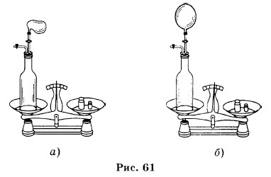 449. Закрытый пробкой флакон помещают под колокол насоса. При выкачивании воздуха из-под колокола пробка из флакона вылетает. Почему? 450. Будет ли меняться объем резинового воздушного шарика при его подъеме (изменение температуры не учитывать)? Если да, то как именно? 451. У подножия горы при помощи всасывающего поршневого насоса можно поднимать воду на высоту до 10 м. На какую высоту можно таким же насосом поднять воду на вершине горы, где давление равно 600 мм рт. ст.? 452. Бутылка со сжатым воздухом уравновешена на весах. Сквозь пробку бутылки пропущена стеклянная трубка с резиновым шариком на конце (рис. 61, а). Останутся ли весы в равновесии, если часть воздуха из бутылки перейдет в шарик и раздует его (рис. 61, б)?