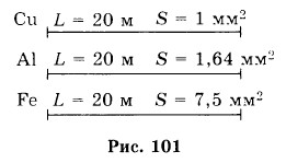 Электрические явления 42. Электрическое сопротивление проводников. Единицы сопротивления. Расчет сопротивления проводника. Удельное сопротивление1020. Выразите в омах значения следующих сопротивлений: 500 мОм; 0,2 кОм; 80 МОм. 1021. Два провода изготовлены из одного материала и площади их сечений одинаковы. Во сколько раз сопротивление одного провода (длиной 10 м) больше сопротивления другого провода (длиной 1,5 м)? 1022. Каково сопротивление медной струны сечением 0,1 мм2 и длиной 10 м. 1023. Железная и медная проволоки равной длины имеют одинаковые сечения. Одинаково ли сопротивление проволок? Если нет, то какая из них будет иметь большее сопротивление и во сколько раз? 1024. Медный тросик имеет длину 100 м и поперечное сечение 2 мм2? Чему равно его сопротивление? 1025. В электрической цепи общая длина подводящих железных проводов сечением 1 мм2 равна 5 м. Определите сопротивление подводящих проводов. 1026. На рисунке 101 изображены медный, алюминиевый и железный проводники. Вычислите сопротивление каждого проводника.