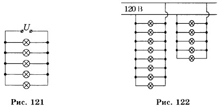 1117. В сеть с напряжением 220 В включены параллельно 200 осветительных приборов, каждый сопротивлением 240 Ом. Каково сопротивление всего участка цепи? Какова сила тока, проходящего через каждый прибор? Какова сила тока во всей цепи? 1118. Провод сопротивлением 98 Ом разрезали на несколько одинаковых частей и получившиеся куски соединили параллельно. Измерили сопротивление этого участка — оно оказалось 2 Ом. На сколько частей разрезали провод? 1119. В сеть с напряжением 120 В включены пять одинаковых ламп (рис. 121), каждая сопротивлением 200 Ом. Какова сила тока в цепи? 1120. На рисунке 122 изображен участок цепи с двумя группами параллельно соединенных электроламп. В левой группе 8 лампочек сопротивлением по 400 Ом каждая, в правой группе 5 лампочек сопротивлением по 200 Ом каждая. Напряжение на каждой лампочке 120 В. Какова сила тока, проходящего через левую группу? через правую группу?