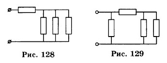 1128. Одинаковые сопротивления, каждое из которых равно 4 Ом, соединены как показано на рисунке 130. Каково общее сопротивление и сила тока, если напряжение на клеммах равно 12 В? 1129. Сопротивления по 4 Ом каждое соединены как показано на рисунке 131. Напряжение между клеммами равно 12 В. Каково общее сопротивление? Какова сила тока в цепи?