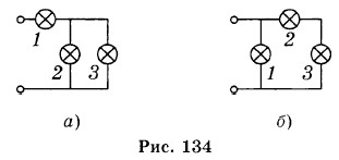 Электрические явления Работа и мощность электрического тока. Единицы работы электрического тока. Нагревание проводников электрическим током. Закон Джоуля-Ленца1174. По какой формуле можно вычислить мощность тока на участке проводника, если известна сила тока и сопротивление данного участка проводника? 1175. По обмотке электрической печи сопротивлением 300 Ом идет ток 5 А. Вычислите, какую мощность потребляет печь. 1176. По какой формуле можно вычислить мощность тока на участке проводника, если известно напряжение на концах участка цепи и сопротивление данного участка проводника? 1177. Какую мощность потребляет электролобзик сопротивлением 240 Ом при напряжении 120 В? 1178. Реостат потребляет мощность 60 Вт при напряжении на зажимах 90 В. Каково сопротивление реостата? 1179. Пять нагревателей по 100 Вт каждый включены параллельно. Напряжение в сети 220 В. Найдите силу тока в цепи. 1180. На рисунке 134 изображены две схемы включения в цепь трех одинаковых лампочек. В какой лампе больше мощность тока и во сколько раз? Рассмотреть случай (а) и случай (б).
