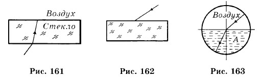 1300. Вычислите показатель преломления стекла относительно воды при прохождении луча света из воды в стекло. 1301. На рисунке 161 изображен луч, который идет наклонно к грани стеклянной пластинки, а затем выходит в воздух. Начертите ход луча в воздухе. 1302. На рисунке 162 показан луч, который падает из воздуха на грань стеклянной пластинки, проходит ее и выходит в воздух. Начертите ход луча. 1303. Луч из воздуха идет в среду А (рис. 163). Найдите показатель преломления среды А. 1304. Оптическая плотность воздуха увеличивается с приближением к поверхности Земли. Как это повлияет на ход луча, входящего в атмосферу: а) вертикально,