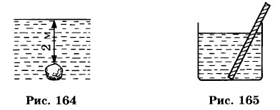 1305. Когда вы смотрите через толстое стекло, предметы кажутся вам смещенными. Почему? 1306. Почему планеты на небе светятся ровным светом, а звезды мерцают? 1307. Луна имеет форму шара, но нам с Земли ее поверхность кажется плоской, а не выпуклой. Почему? 1308. Когда мы смотрим сквозь воду вниз, на дно водоема, оно кажется ближе, чем есть на самом деле. Почему? 1309*. Прочтите предыдущую задачу. Определите, во сколько раз действительная глубина больше кажущейся. 1310*. Камень лежит на дне реки на глубине 2 м (рис. 164). Если смотреть на него сверху, то на какой глубине он нам будет казаться? 1311. Прямой стержень опущен в воду (рис. 165). Наблюдатель смотрит сверху. Каким ему представится конец стержня?