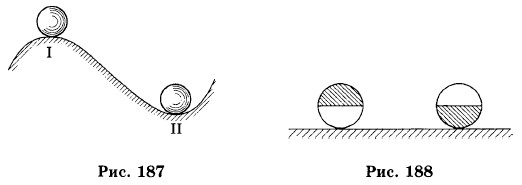 1492. Дирижабль летит на юг со скоростью 20 м/с. С какой скоростью и под каким углом к меридиану будет лететь дирижабль, если подует западный ветер со скоростью 10 м/с? Под каким углом к меридиану должен лететь дирижабль, чтобы при данном ветре он продолжал лететь на юг? Какова в этом случае будет его скорость? 1493. Скорость моторки относительно воды равна 5 м/с, скорость течения реки относительно земли равна 1 м/с, ширина реки 600 м. Моторка, пересекая реку, движется перпендикулярно течению. Какова скорость моторки относительно земли? За какое время она переплывет реку? На сколько метров моторка будет снесена течением? 1494. На окнах неподвижного автомобиля дождь оставляет полосы, наклоненные под углом 60° к вертикали. При движении автомобиля со скоростью 10 м/с полосы от дождя вертикальны. Какова скорость капель дождя в безветренную погоду? 1495. Почему удобнее нести два ведра с водой, чем одно? 1496. Почему человек, несущий на спине тяжесть, наклоняется вперед? 1497. Почему воз с сеном менее устойчив, чем телега без сена? 1498. На рисунке 187 изображен однородный шар в двух равновесных положениях. Каково равновесие шара в этих положениях и почему? 1499. Каково равновесие неоднородного шара в положениях, изображенных на рисунке 188 (заштрихованная половина шара изготовлена из более плотного вещества)?