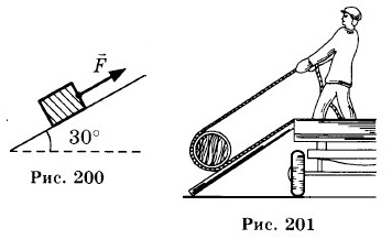 1533. С помощью наклонных досок длиной 2 м поднимают бревно (см. рис. 201). Масса бревна 200 кг, высота подъема 0,75 м. Какую силу надо приложить к веревке? 1534. Ответить, не прибегая к расчетам по формуле: а) С каким ускорением движется тело, если действующая на него сила в 2,7 раза меньше веса? в 14 раз меньше веса?