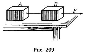 1564. На горизонтальном гладком столе лежат два бруска А и В, соединенные нитью. Масса каждого бруска 1 кг. На эти бруски действует сила F = 0,4 Н, как показано на рисунке 209.