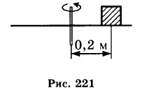 1620. Кубик массой 0,4 кг положили на грампластинку на расстоянии 0,2 м от ее центра (рис. 221). При вращении пластинки линейная скорость кубика равна 0,2 м/с. Каково ускорение кубика? Какая сила удерживает кубик на пластинке и чему она равна? 1621. Мотоцикл проходит поворот радиусом 20 м. Коэффициент трения между колесами и землей равен 0,7. С какой наибольшей скоростью может двигаться мотоцикл, чтобы не возникло заноса? 1622. Во время дождя коэффициент трения между колесами мотоцикла и землей уменьшается до 0,1. Решите предыдущую задачу для дождливой погоды. Во сколько раз найденная вами скорость мотоцикла из предыдущей задачи будет меньше во время дождя? 1623. Определите центростремительную силу, действующую на вагон метро массой 16 т, когда он движется со скоростью 8 м/с по закруглению радиусом 80 м. 1624. Постройте траекторию движения тела, брошенного горизонтально со скоростью 30 м/сек с высоты 80 м. Определите, на каком расстоянии от места бросания тело упадет на землю и скорость его в момент удара о землю. Сопротивление воздуха не учитывать. Принять g = 10 м/сек2. 1625. С мачты парохода с высоты 10 м над палубой уронили мяч. Скорость парохода 18 км/час. На сколько успеет переместиться пароход за время падения мяча? Где упадет мяч? Какова траектория движения мяча по отношению к поверхности моря? Какова скорость мяча в момент удара о палубу? 1626. На краю стола лежит кусочек мела. Мелу сообщили горизонтальный толчок по направлению, перпендикулярному к классной доске. След от удара мела о доску лежит на 20 см ниже поверхности стола. Расстояние доски от края стола 1 м. Определите начальную скорость мела. 1627. С какой скоростью надо бросить тело в горизонтальном направлении с высоты 20 м, чтобы скорость его в момент падения на землю была 25 м/сек? (Указание. Решите эту задачу на основании закона сохранения энергии.) 1628. Грузовик массой 5000 кг движется со скоростью 28,8 км/ч по выпуклому мосту с радиусом кривизны 0,04 км. С какой силой давит грузовик на середину моста? С какой скоростью он должен ехать, чтобы не оказывать давления на верхнюю точку моста? 1629. Тепловоз массой 15 т движется по вогнутому мосту с радиусом кривизны 0,05 км. Сила давления тепловоза на середину моста равна 149,5 кН. Какова скорость тепловоза? 1630. Автофургон идет по закруглению радиусом 200 м со скоростью 72 км/ч. При этом внутри фургона производится взвешивание на пружинных весах груза массой 49 кг. Определите показания пружинных весов. 1631. Самолет делает «мертвую петлю» радиусом 0,245 км в вертикальной плоскости. При какой наименьшей скорости самолета в верхней части петли летчик не будет отрываться от кресла? 1632. Самолет, летящий со скоростью 360 км/ч, описывает в вертикальной плоскости «петлю Нестерова» радиусом 0,2 км. Во сколько раз сила, прижимающая летчика к сиденью в нижней точке петли, больше его веса? 1633. Самолет, летящий со скоростью 540 км/ч, описывает в вертикальной плоскости «мертвую петлю» радиусом 500 м. Во сколько раз сила, прижимающая летчика к сиденью, в нижней точке петли больше силы, прижимающей летчика к сиденью, в верхней точке петли? 1634. Коленчатый вал двигателя делает 3600 об/мин. Найдите угловую скорость и период вращения коленчатого вала. 1635. Винт вертолета вращается с частотой 1500 об/мин. Скорость полета вертолета 72 км/ч. Сколько оборотов сделает винт на пути 120 км? 1636. Определите угол поворота Земли вокруг