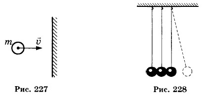 1664. Космонавт для проведения ремонтных работ на космической станции вышел в открытый космос без страховочного троса. Есть ли способ вернуться на борт, не прибегая к помощи других космонавтов? 1665. Пуля массой 9 г летит со скоростью 800 м/с. Чему равен импульс пули? 1666. Космический корабль массой 6,6 т движется по орбите со скоростью 7,8 км/с. Каков импульс корабля? 1667. Астероид массой 50 кг движется со скоростью 40 км/с. Найдите модуль импульса астероида. 1668. Скорость тела увеличилась в 2 раза. Во сколько раз изменился импульс тела? 1669. Скорость тела уменьшилась в 2 раза. Во сколько раз изменился импульс тела? 1670. Импульс тела увеличился в 4 раза. Во сколько раз изменилась скорость тела? 1671. Как изменился импульс автомобиля массой 1 т при увеличении его скорости от υ1 = 6 км/ч до υ2 = 72 км/ч. 1672. Камень массой 2 кг упал с утеса высотой 4,9 м. Найдите импульс камня в конце падения. 1673. Теннисный мяч массой 0,1 кг летит горизонтально со скоростью 10 м/с. Удар ракетки отбрасывает его в противоположную сторону со скоростью 20 м/с. Найдите модуль изменения импульса мяча. 1674. Мячик массой 0,05 кг подлетает к стенке (рис. 227) со скоростью 4 м/с, ударяется о нее и отскакивает с той же по модулю скоростью. Определите модуль изменения импульса шарика. Какой импульс стенка сообщила шарику? 1675. Если по неподвижной лодке на воде начать двигаться с кормы на нос, то лодка станет двигаться в противоположном направлении. Объясните, почему. 1676. На идеально гладкой горизонтальной поверхности сидит человек. Может ли он передвигаться по этой поверхности? Объясните. 1677. На рисунке 228 изображены три стальных шарика одинаковой массы, подвешенные на нитях одинаковой длины так, что шарики касаются друг друга. Если отклонить правый шарик на некоторый угол и отпустить, то он, ударившись о средний шарик, останавливается; при этом отскакивает левый, отклоняясь на такой же угол. Средний шарик остается в покое. Объясните этот опыт.